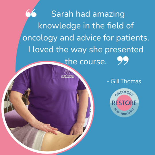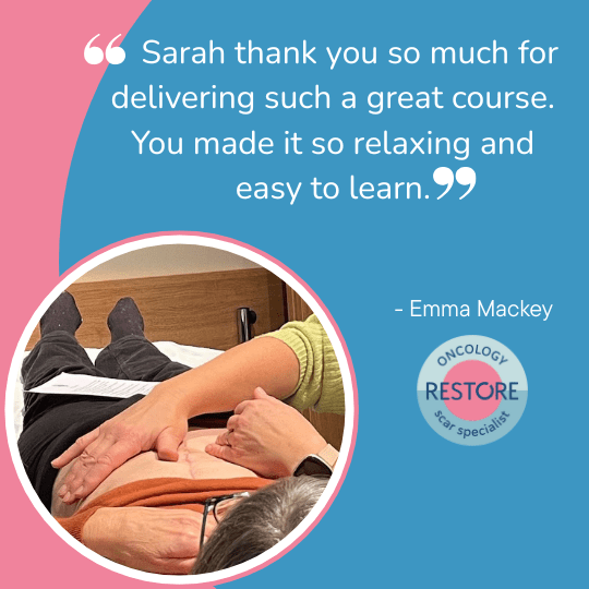 Sarah is also trained in the Dr. Vodder method of Manual Lymphatic Drainage with Combined Decongestive Therapy and continues to attend CPD courses with the local NHS Lymphatic School. Sarah began her scar therapy journey alongside her oncology training but went on to further her education with Emma Holly in 2018. Many volunteers at The Old Mill Foundation also started their scar tissue journey in 2018 and the results they have achieved is incredible. Sarah has a passion for teaching and enjoys passing on her years of experience in cancer care to others.