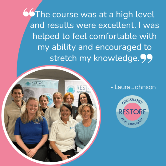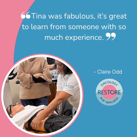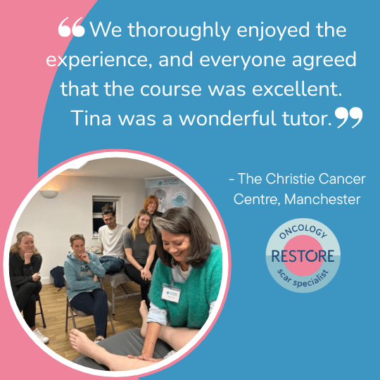 Early on, Tina developed an interest in additional mechanisms that can help patients recover from the impact of diagnosis and side effects of cancer treatment. During the 1990’s Tina qualified in Massage and Aromatherapy, and since then has developed and led teams delivering integrated cancer care both in the hospital setting and in the voluntary sector. Tina further honed her skills whilst at Breast Cancer Haven, adding Manual Lymphatic Drainage and Scar Therapy to her qualifications and has been providing these treatments since 2015. Tina was fortunate to train with the late Willie Fourie and met Emma when she trained with her in ScarWork, and later the RESTORE programme. Tina has been involved in training and teaching throughout her nursing career including the graduate nurse pathway. Tina is passionate about sharing knowledge and skills in order to broaden the availability of vital scar therapy to those who need it. Her teaching style is relaxed, supportive and playful.